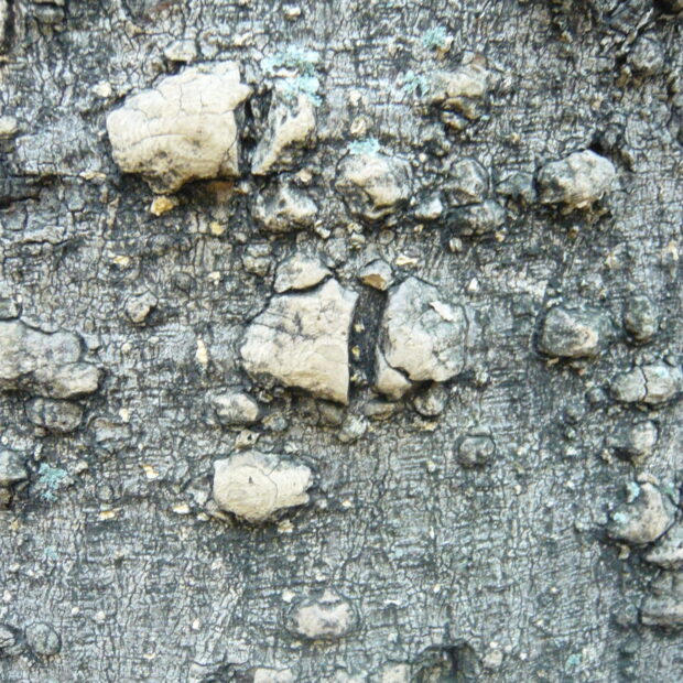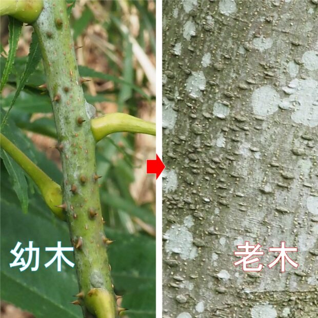 幹は灰色がかった茶色で短いトゲがたくさんあります。 老木になるとトゲの先がなくなり、 いぼのようなふくらみがポツポツと残ります。 ちなみに、 トゲは葉の軸にもあります。