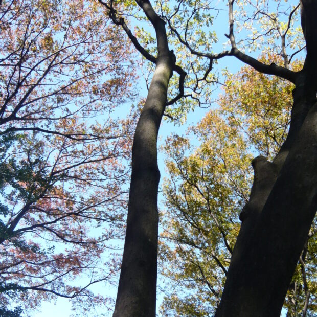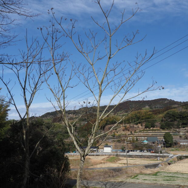 高さ15mほどにもなる落葉高木です。 木のてっぺんの方で枝を斜め上に伸ばし、 大きな葉を横に広げるので、 逆三角形のような樹形になります。
