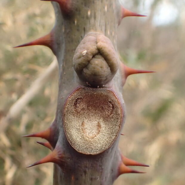 太い枝にとげとげ、 大きくて丸い葉痕の上に「グー」のような形の芽、 というのが特徴です。 芽鱗は3枚。 葉痕の維管束痕はCの形をしていて3つあり、 きかんしゃトーマスのようなにっこり顔に見えます。