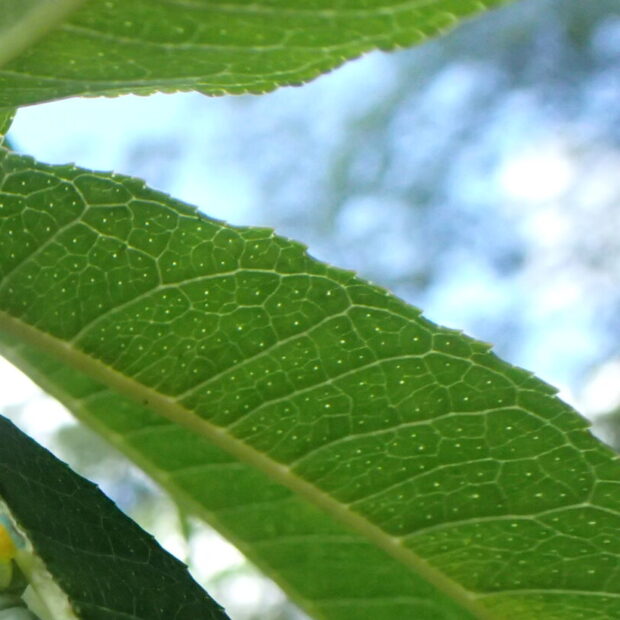 1本の軸に、 先のとがった細長い葉が何対も向かい合ってついたものが1枚の葉です。 なので1枚の葉の長さは80cm以上になることもあります。 表にも裏にも毛はなく、 葉の面全体に油点があります。 葉をもむと油点がこわれてさわやかな香りがします。
