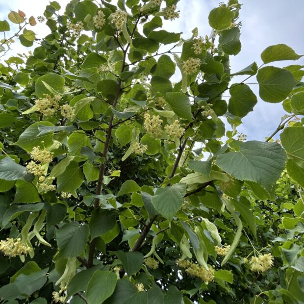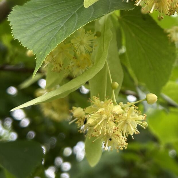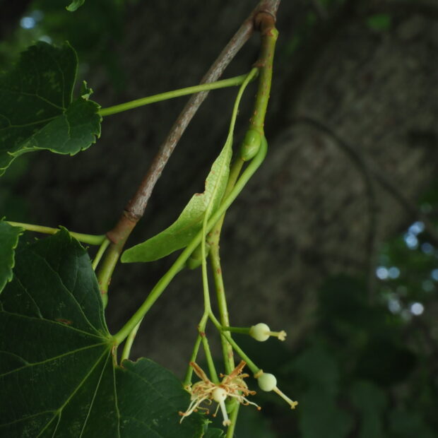 ハート型の葉、 クリーム色で香りのよい花、 プロペラのついた実の房など、 一年中見どころの多い木です。 昔から、 樹皮の繊維で着物や縄などが作られ、 生活に役立ってきました。 花は蜂蜜を取るための蜜源として利用されます。
