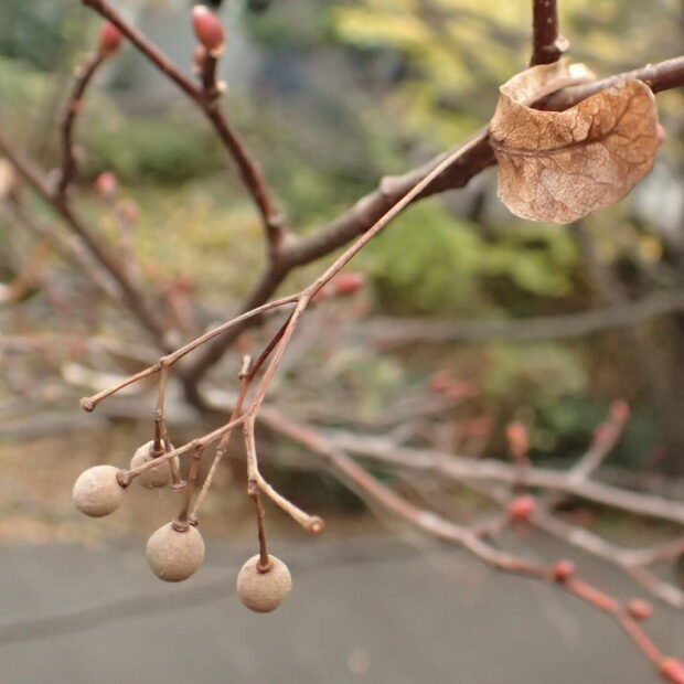 短い毛のある丸い実が房になってつきます。 1房の柄に1枚、 細長い葉っぱのようなものがついています。 実が熟すと、 その葉っぱがヘリコプターのプロペラのような役割をし、 風に乗ってクルクル回りながら実を遠くへ運びます。