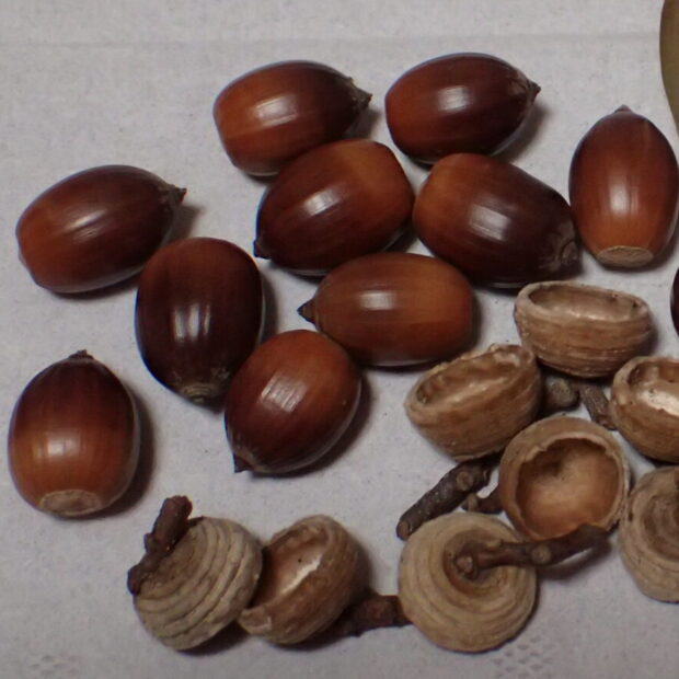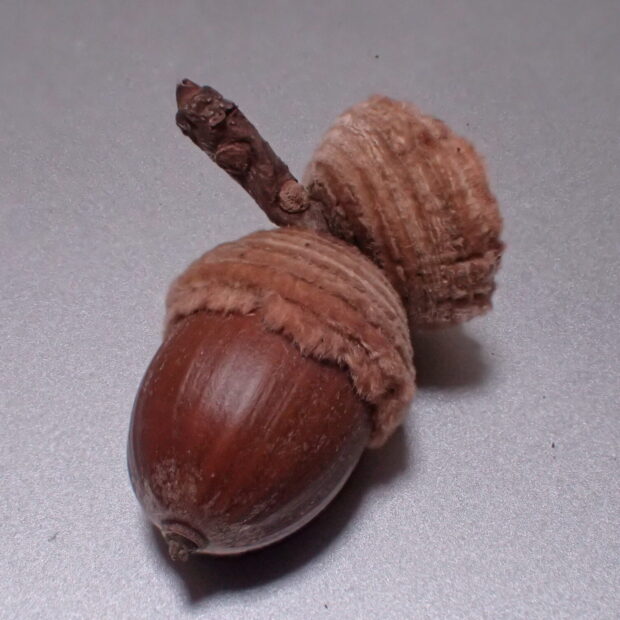 ふわふわ帽子のどんぐりです。 春に花が咲いてからどんぐりの赤ちゃんができ、 少しずつ大きくなって翌年の秋に長さ2cmくらいのどんぐりになります。