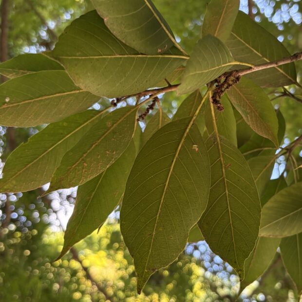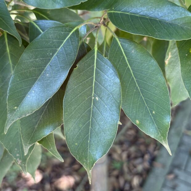 大きな木の下にふわふわ帽子のどんぐりが落ちていたら、 アカガシかなと思って葉を見てみましょう。 大きくてつやのある常緑の葉、 縁にギザギザがなく柄の長い葉、 それもアカガシの特徴です。 神社や屋敷林などで大木が見られることがあります。