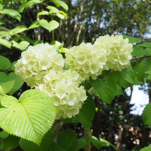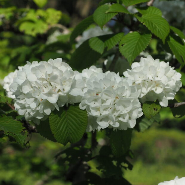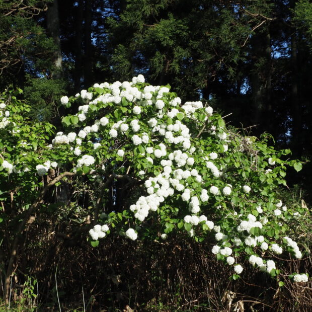 白いアジサイ似の小さめな手まりのような花が、 枝にポンポンポンと並んで咲きます。 園芸種として生まれ、 古くから栽培されてきました。 もとになったのは、 本州の日本海側に生えるケナシヤブデマリであるといわれています。