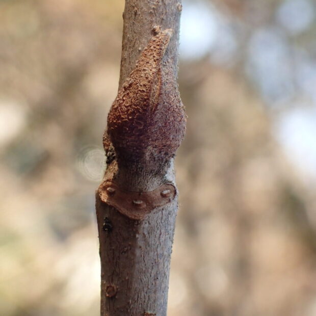 茶色の2枚の芽鱗に包まれた、 しずく型の冬芽です。 葉痕の維管束痕は3つで、 お顔に見えます。