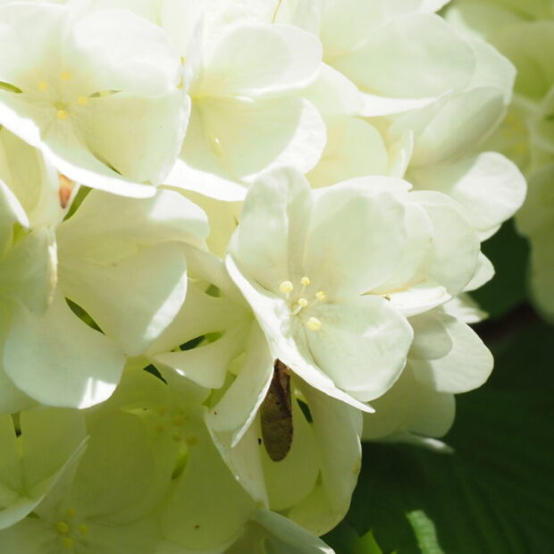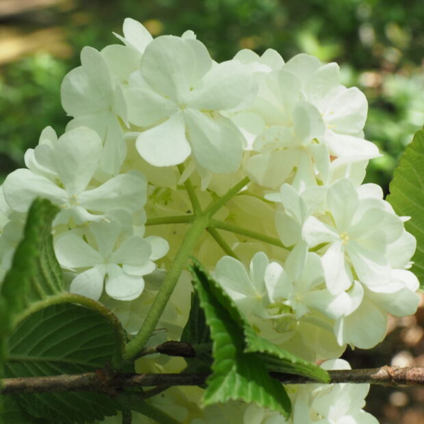 小さな白い花が集まって手まりのような形になり、 ポンポンポンと枝に咲きます。 一つ一つの白い小さな花は、 5つに深く切れ込んだ花びらが変化した装飾花で、 雌しべと雄しべは退化しています。