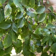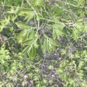 エノキは虫たちに人気の木。 日本の国蝶、 オオムラサキの幼虫はエノキの葉を食べて育ちます。 赤い小さな実は、 鳥たちの大好物です。