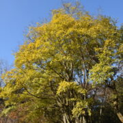 とても太く大きくなる木です。 昔は街道の一里塚や橋のたもとによく植えられました。 横に長い枝を伸ばすので、 街道を旅する人が木陰で休んだそうです。 秋の黄葉(こうよう)がきれいです。