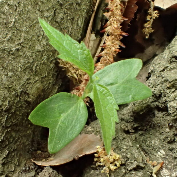 大きなエノキの木の下や、 実を食べた鳥が移動した先の森や公園、 街なかの植え込みなどでエノキが発芽していることがあります。