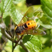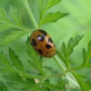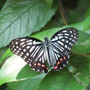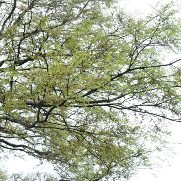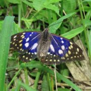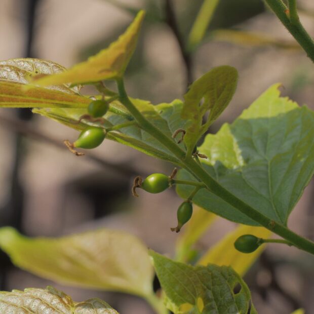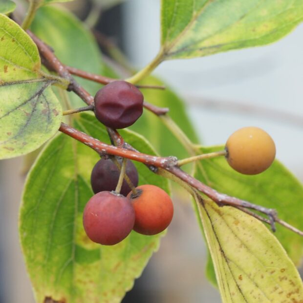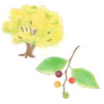 エノキは虫たちに人気の木。 日本の国蝶、 オオムラサキの幼虫はエノキの葉を食べて育ちます。 赤い小さな実は、 鳥たちの大好物です。