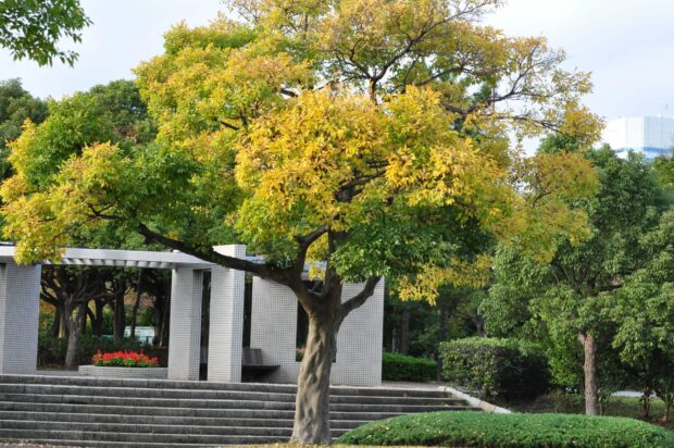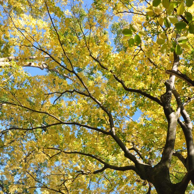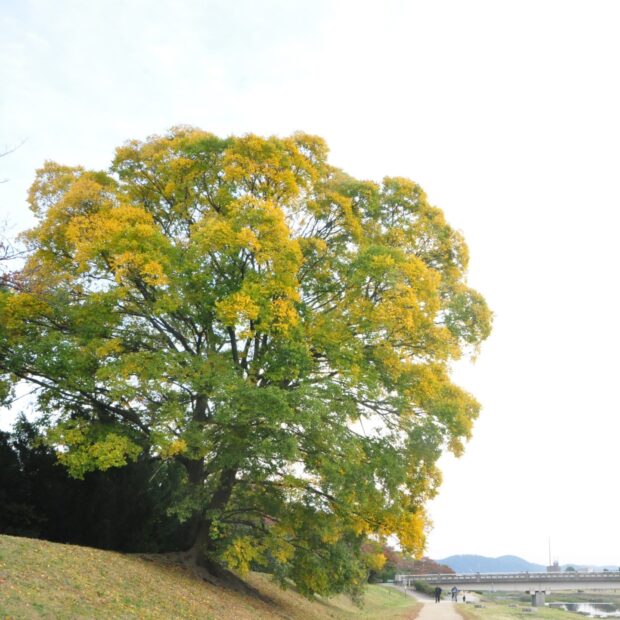 とても太く大きくなる木です。 昔は街道の一里塚や橋のたもとによく植えられました。 横に長い枝を伸ばすので、 街道を旅する人が木陰で休んだそうです。 秋の黄葉(こうよう)がきれいです。