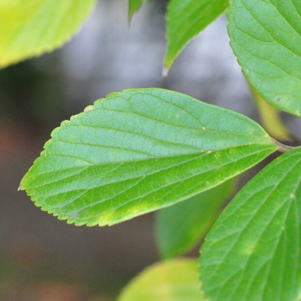 葉の表面はツルツルで、 縁(ふち)には3分の1ぐらいだけギザギザがあります。