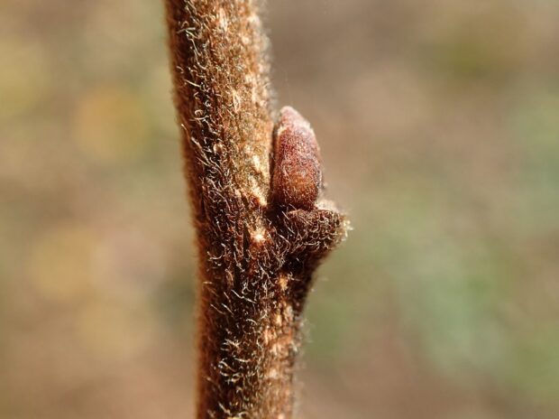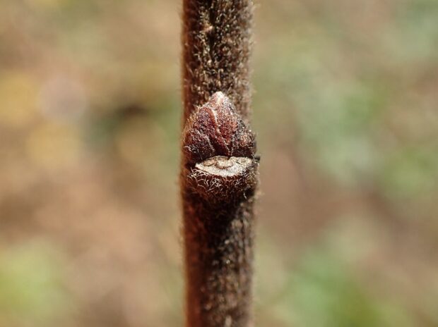 丸くて小さな冬芽です。 葉痕(葉の落ちた跡)は三角形です。
