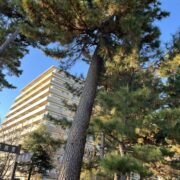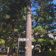 高木で海岸沿いに生えるマツ。 樹皮が黒っぽく、 冬芽が白く、 葉は硬い。