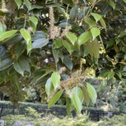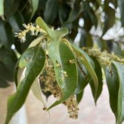 ひも状の雄花はくさい匂いを放ち、 虫を呼びます。 雌花はとっても小さいくて見つけるのが大変です。