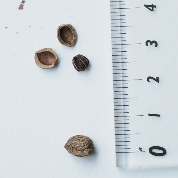 雌雄異株なので、 雌の木にだけ実がつきます。 赤い実が目立ちますが食べごろなのは黒くなった頃です。 真ん中には固い種が一個入っています。