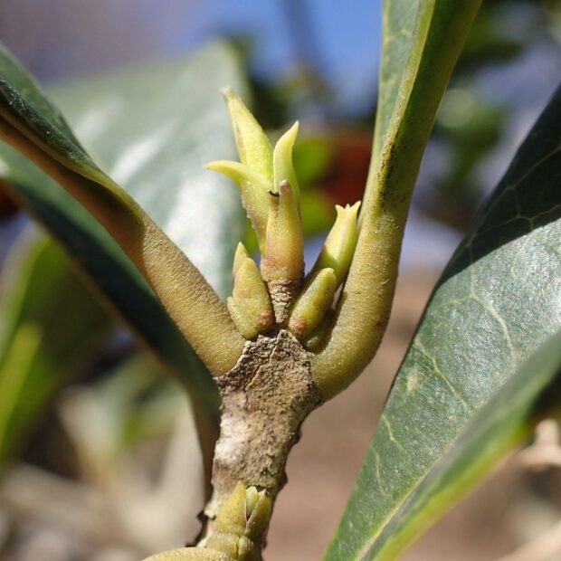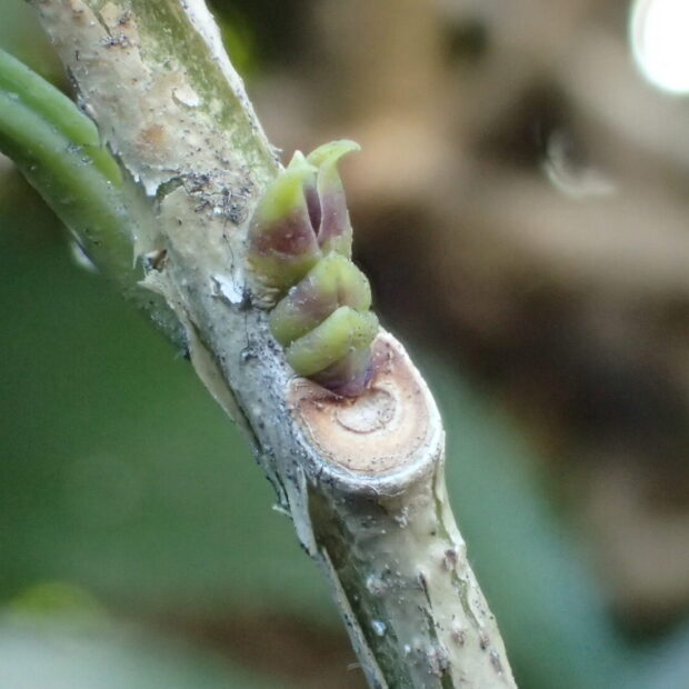 枝先にも、 枝の途中にも、 たくさんの芽が用意されています。 枝の途中に縦に並んでいる芽の上の方の芽から花が咲きます。