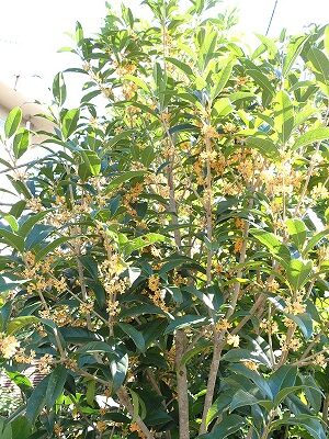 キンモクセイの葉はしわが多くて地味なタイプですが、 小さな花はかわいくて香りが良いです。 雄の木しかないですが、 秋に2~3回咲くことがあります。 気候が不安定なときに何度か分けて花を咲かせますが、 オスしかいないので切ないです。 バッサリ切られても切り株から枝を出し、 数年後また咲きます。 割としぶとく、 強い木です。