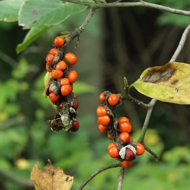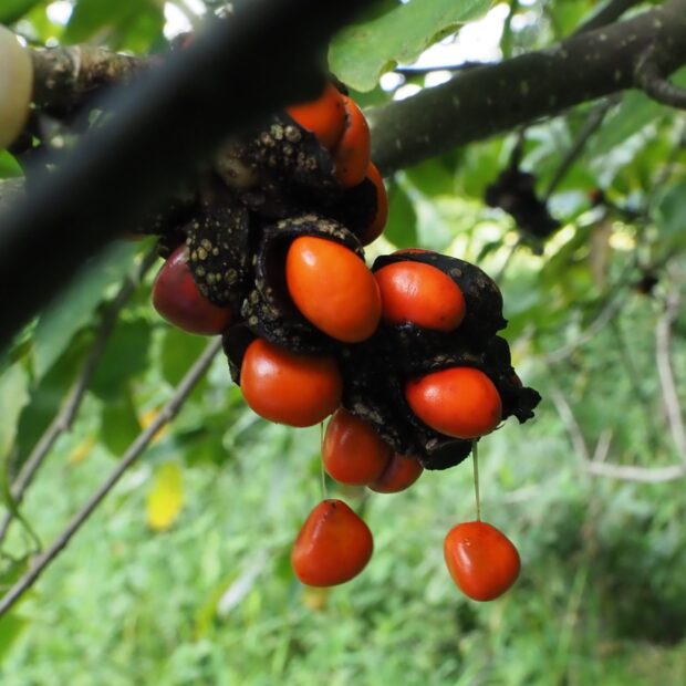 拳(こぶし)のような面白い形の実がなります。 熟すと中から真っ赤な種が出てきて糸を引きます。