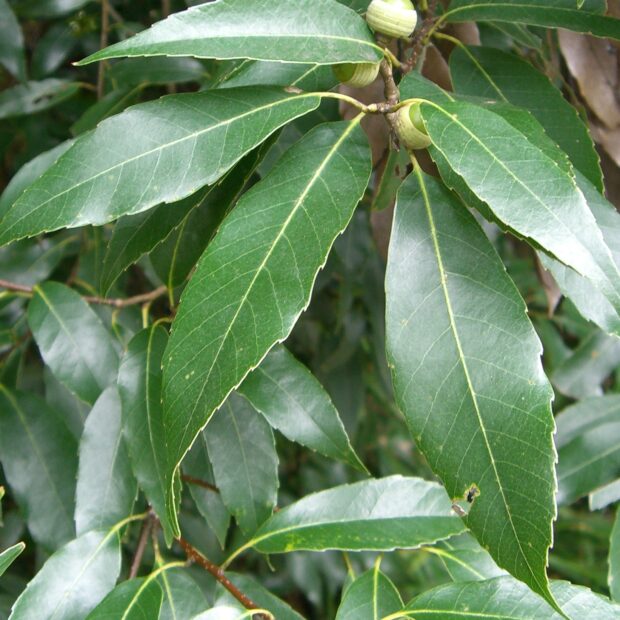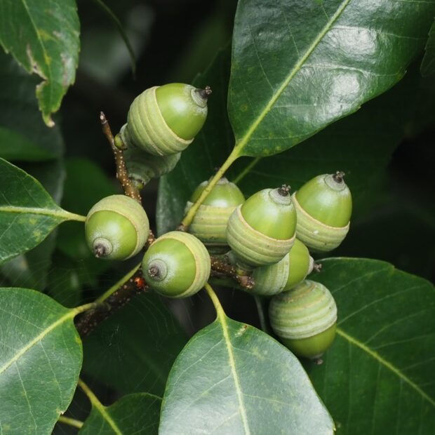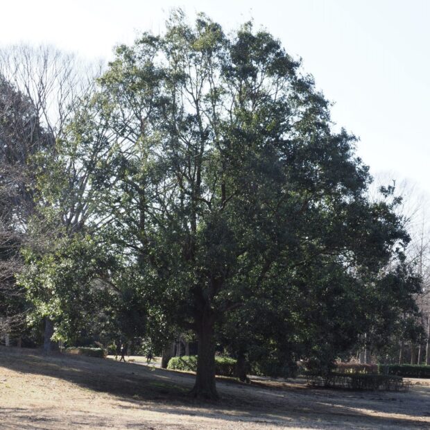 沢山のドングリをつける木です。 ドングリのなる木はがっしりした感じの木が多いですが、 シラカシは葉が小さめでほっそりとしています。 幹は灰黒色で落ち着いた感じです。 そのため庭木としてもよく植えられます。