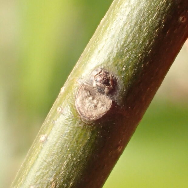 すべすべのほっそりした葉で、 先の3分の2ぐらいにギザギザがあります。 葉の裏が白っぽいのが特徴です。