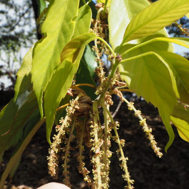 雄花はヒモのように吊り下がります。 雌花は見つけるのが難しいぐらい小さいです。