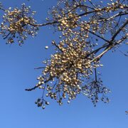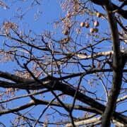 大きな葉痕に丸い冬芽がちょこんと乗っています。