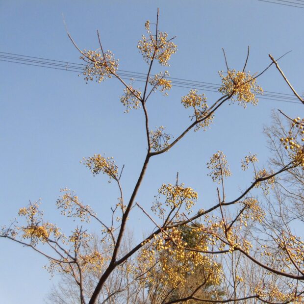 クリーム色の実ができます。 実は冬に葉が落ちても残るのでとても目立ちます。 中に1個の星型の硬い種のようなものが入っていますが、 それは種ではなくて、 さらにその中に細長い種が入っています。