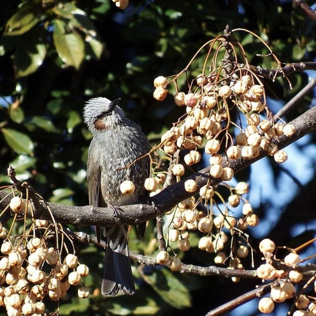 センダンの実を食べに、 ヒヨドリなどの鳥がやってきます。