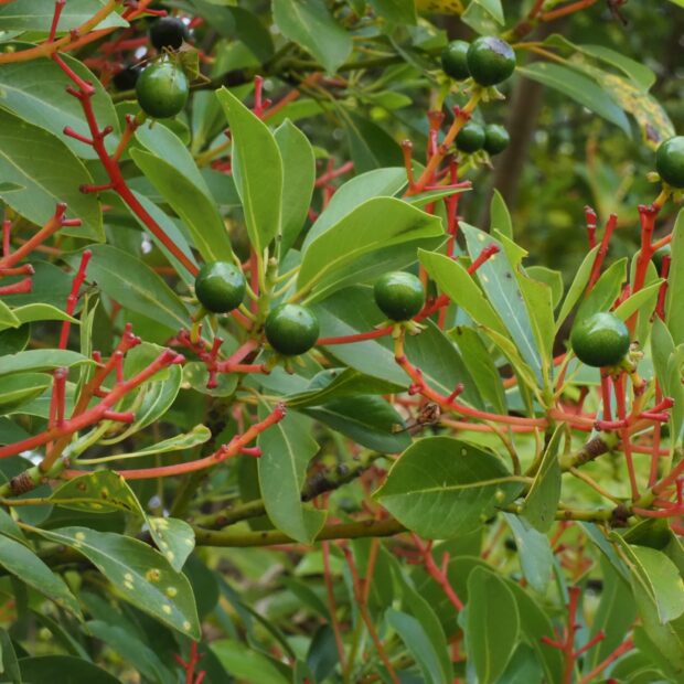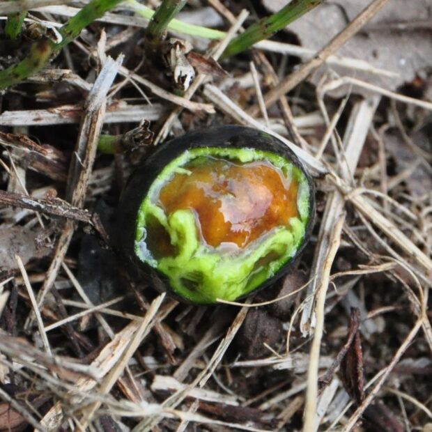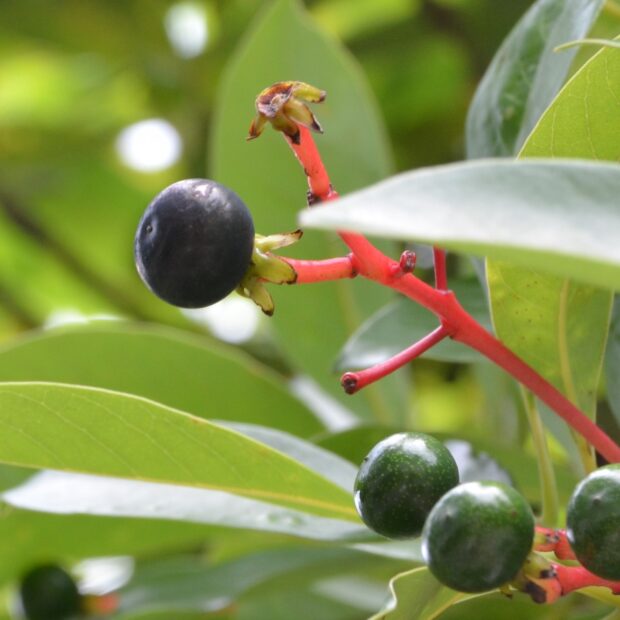 実は緑色から最後に黒色に熟します。 中には網目模様の種が1個入っており、 果柄(かへい、 実のなる枝)は赤みを帯びることが多いです。