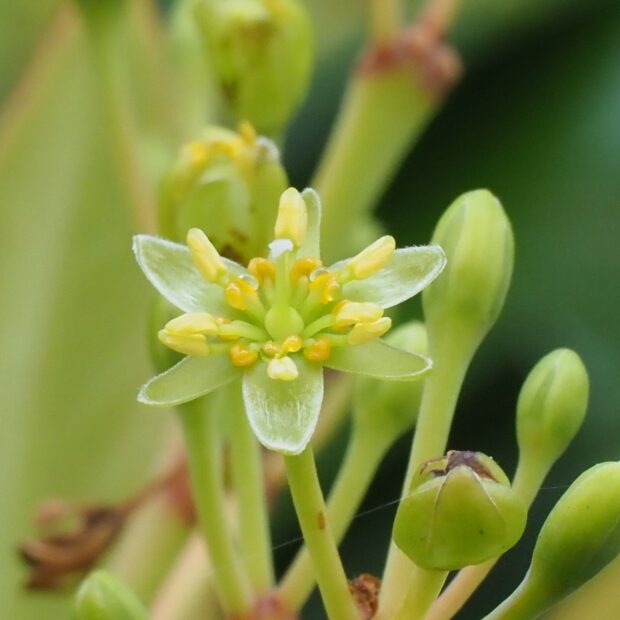 4~5月に黄緑色の小さな花が花束のように集まって咲きます。 良い香りがします。