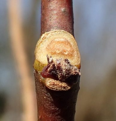 • くっきりとした落枝痕(らくしこん=枝が落ちた跡)に赤い毛むくじゃらの冬芽が目立つ