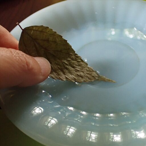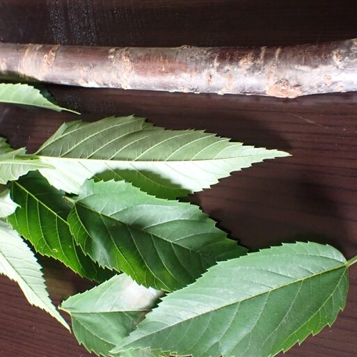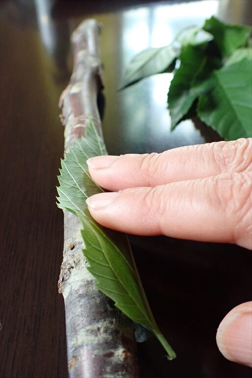 ムクノキの葉は、 サクラの樺細工の仕上げ磨きに使われていたようです。 葉っぱを触ると目が細かいやすりのようです。 粗く削るのではなく、 傷つけないようにやさしく磨く道具として使われていました。