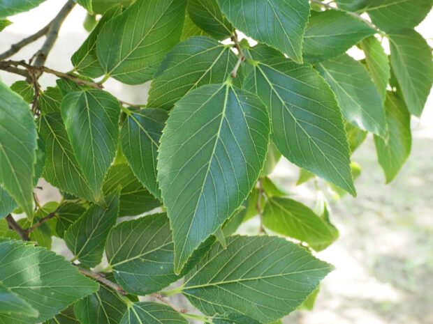 とても早く成長する木です。 良く似たエノキとは葉の表面を指でなでるとガサガサしているので分かります。