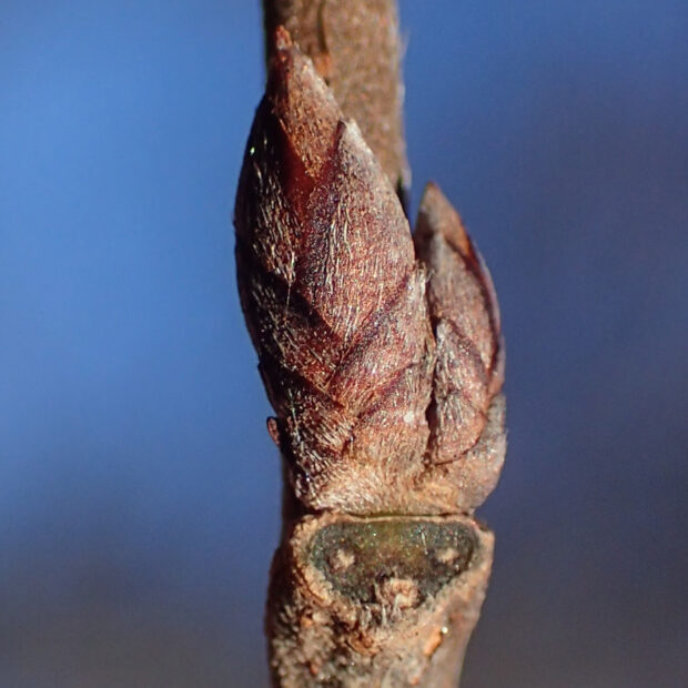 小さな細長い冬芽は、 枝に沿うように付きます。 白い毛のある芽鱗には赤みがかった縁取りがあります。