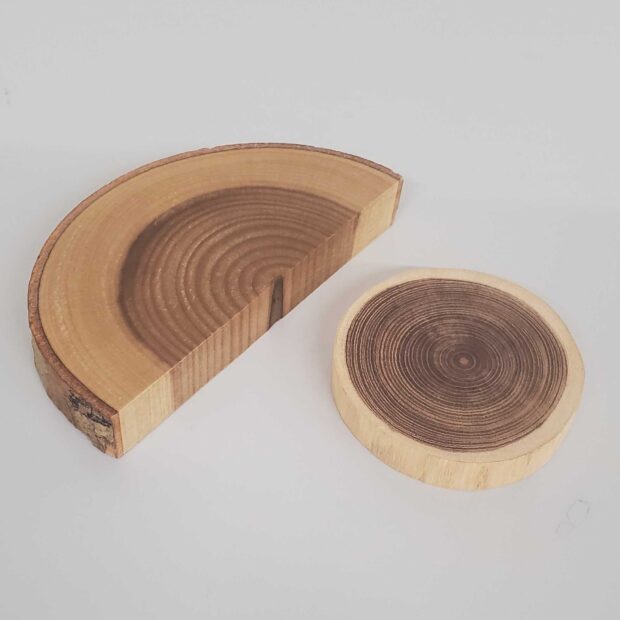 心材が濃い褐色なので、 輪切りにするだけでおしゃれなコースター、 ペンダント、 イヤリング、 モビールができます。 心材と辺材のコントラストを生かした木彫りのフクロウも作られます。 材の特徴を生かした木工を考えてみましょう。