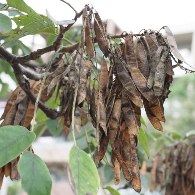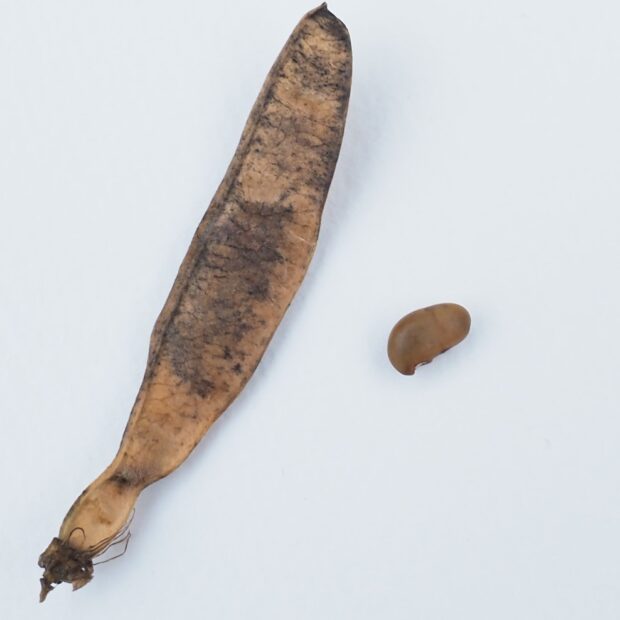 ぺったんこの豆のさやが沢山かたまって実ります。 カサカサでぺったんこなので何もはいってないかと思えば、 中から7~8mmのころっとした豆が2~3個出てきます。