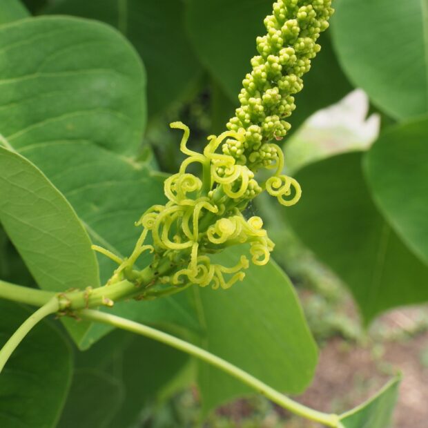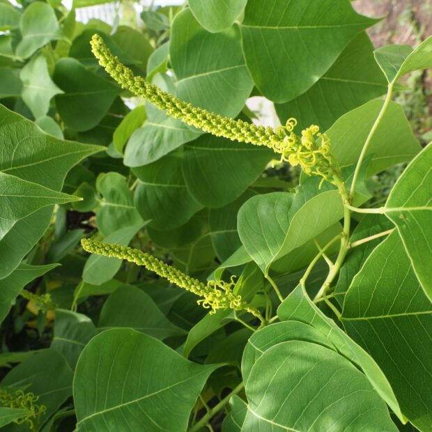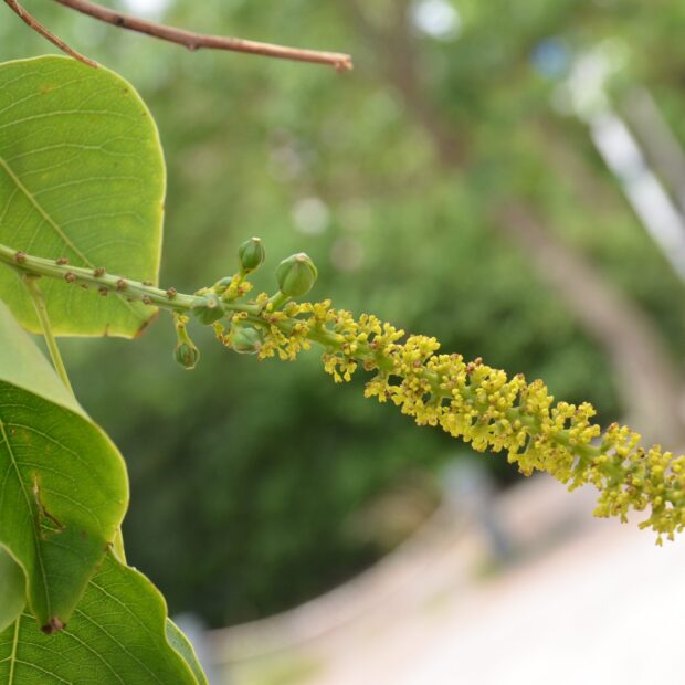 7月頃に枝先に黄色い小さい花を多数つけ、 6㎝~18㎝の房状になります。 上部には多数の雄花、 下部には1から3個の雌花を付けますがものによっては雌花がないこともあります。