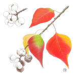 秋、 白い実と鮮やかに紅葉した葉のコントラストが見事です。