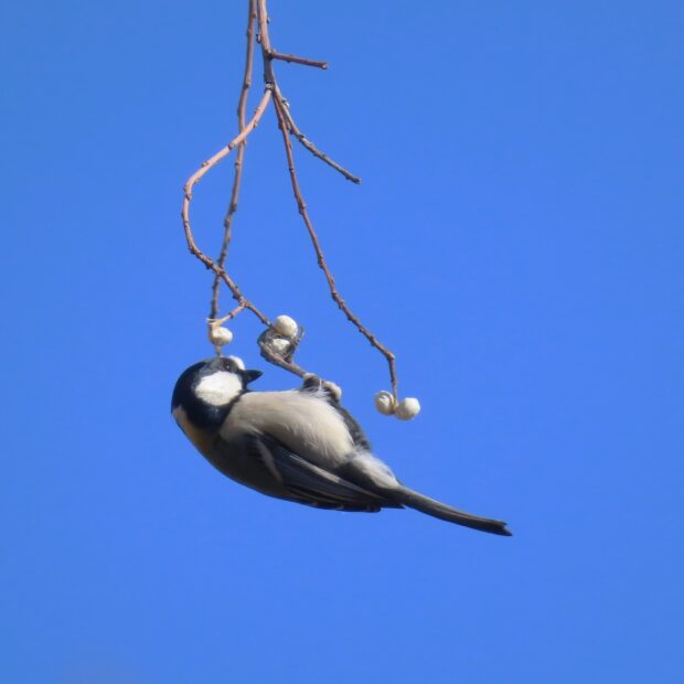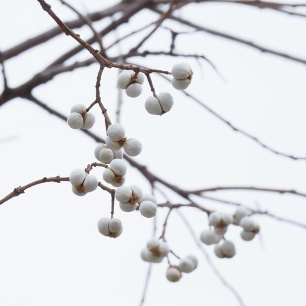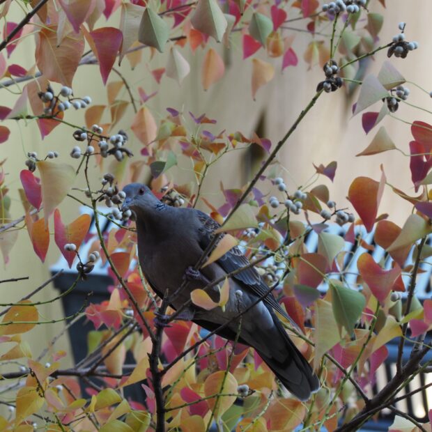 ロウでおおわれた実は鳥たちのごちそう。 キジバト、 ムクドリ、 ヒヨドリ、 スズメ、 シジュウカラなどがやって来ます。