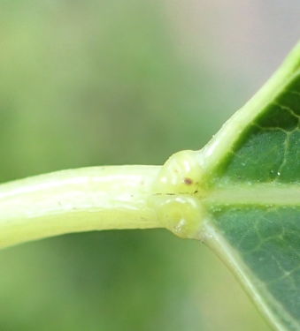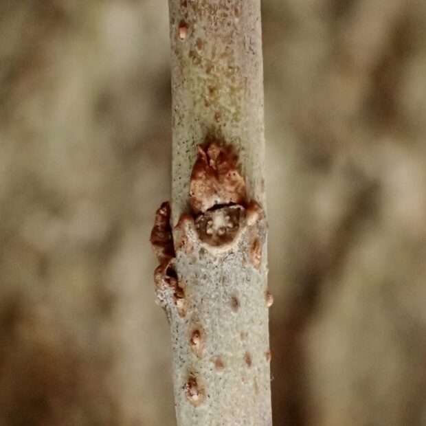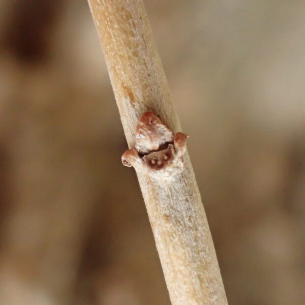 おにぎり型の白っぽい小さな芽です。 葉痕の維管束痕は3つで、 小さなお顔に見えます。 お顔の左右に、 耳のような、 帽子の飾りのようなもの(「托葉」という)があります。