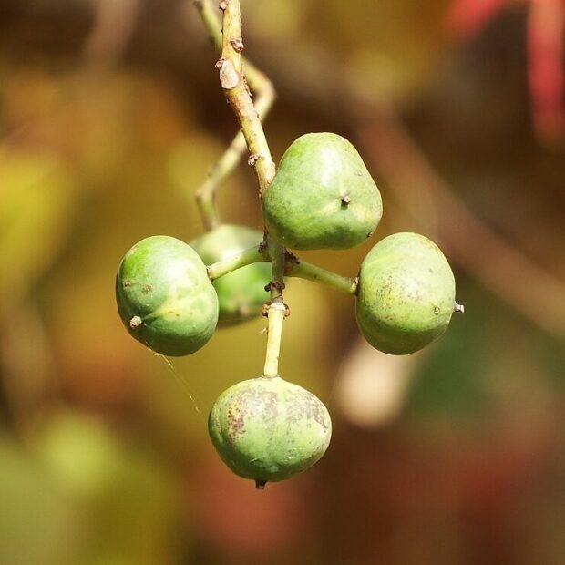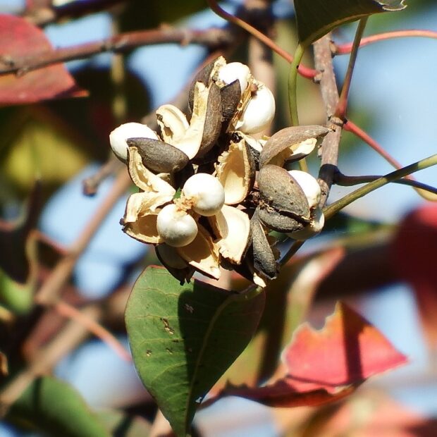 実は10~11月頃になり、 扁球形(丸い巾着のような感じ)の褐色です。 3つに割れ、 中には3個ほどの白い種子が入っています。 種子は白いすべすべとした蝋(ろう)物質の皮に包まれています。 この白い部分は鳥が大好きでよく舐めにきます。