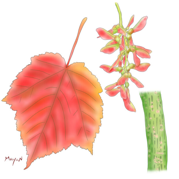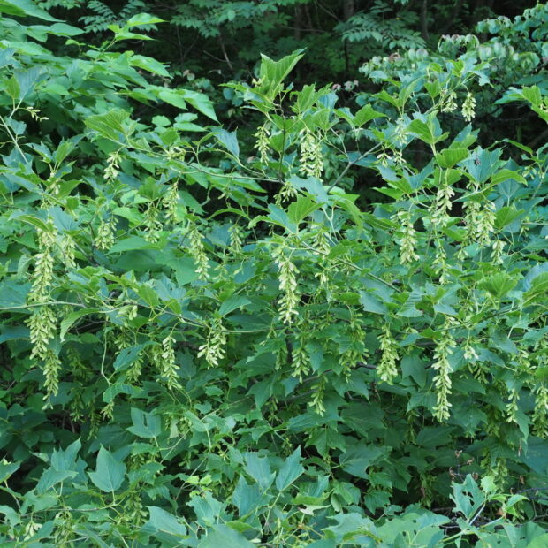 若い木の樹皮がマクワウリのような縞模様になるためウリハダカエデと名づけられました。 大きな葉と房状にかたまっている実もとても目立ちます。