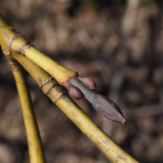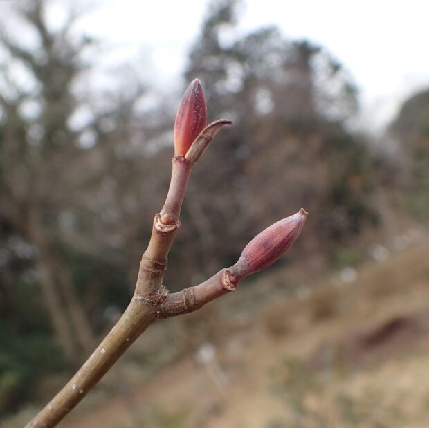 大きくて目立ちます。 芽鱗(芽のをつつむ小片)は2対あり、 紅色または紫紅色です。
