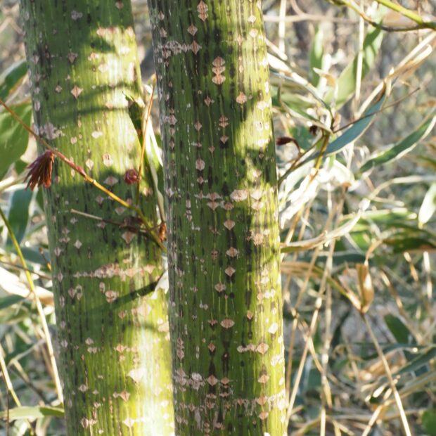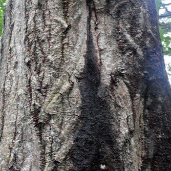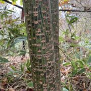 若木は暗緑色に黒い縦じまが入り、 ひし形状の皮目(ひめ・裂け目)が点在します。