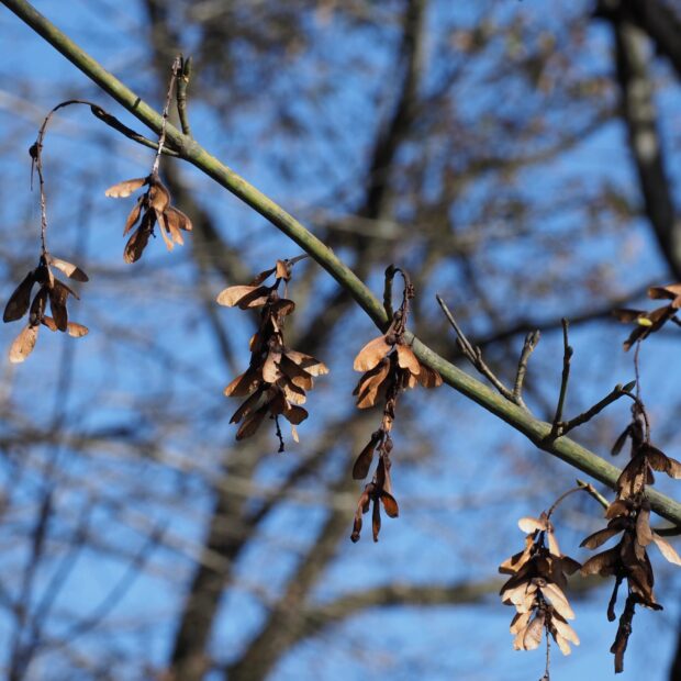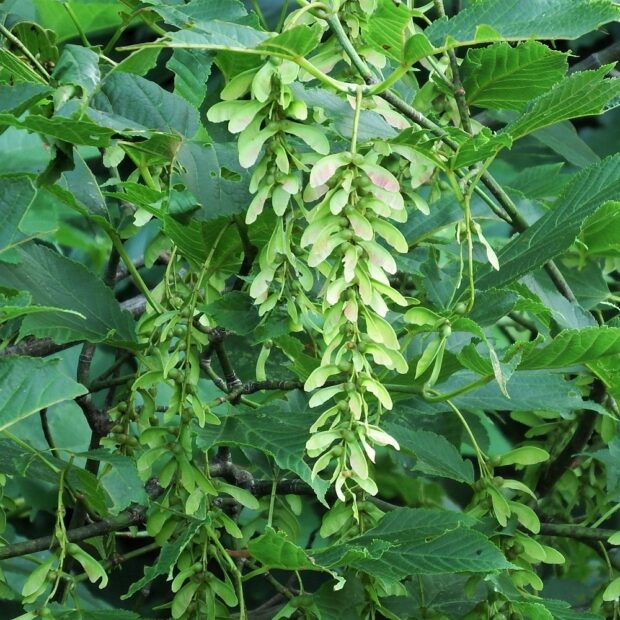 夏から秋に熟します。 ブーメラン型の実が束になってみのります。 翼はほぼ直角に開き、 種子の部分が丸く膨らみます。