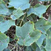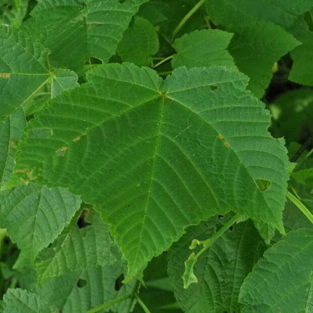 葉は枝に対になって付き(対生)、 割と大きな葉で先端が浅く3~5個に割れています。 先端は鋭く尖り、 縁はギザギザとしてのこぎり状です。