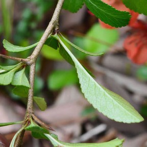 幹は地面を這うか斜め上に伸び、 よく枝を出し、 棘がある落葉低木です。