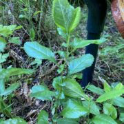 葉は、 根元がシュッと細くなったくさび形です。 縁はギザギザとのこぎり状です。